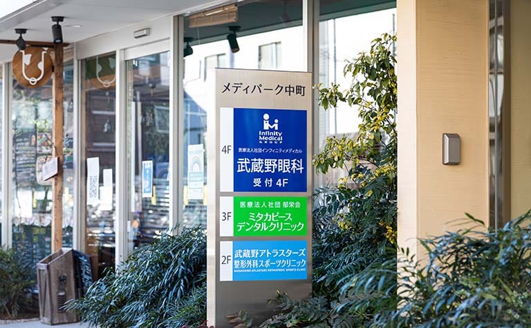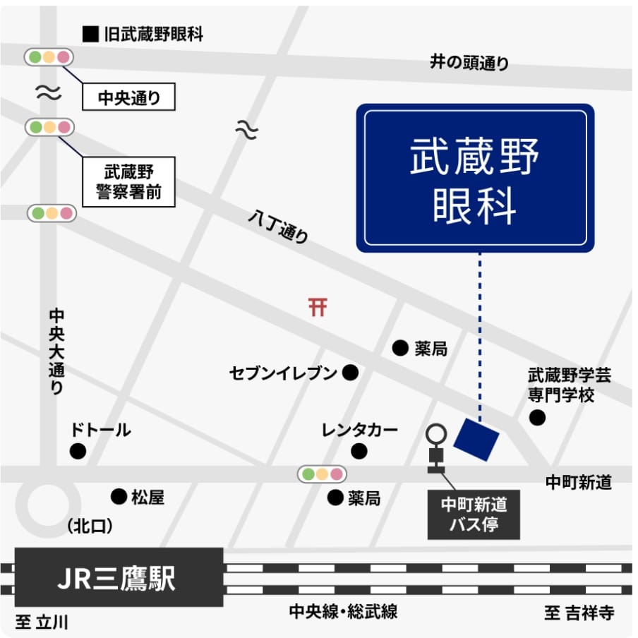 交通アクセス GoogleMAPを見る JR三鷹駅北口を出て、正面にドトールコーヒーを右に曲がり中町新道を進みます。 ウナギ屋さん、お蕎麦屋さんを越えて、三角ロータリーをぐるっと反対側へ、20メートルほどで武蔵野眼科の青い置看板がございます。 エレベーターで4階受付へお願いします。